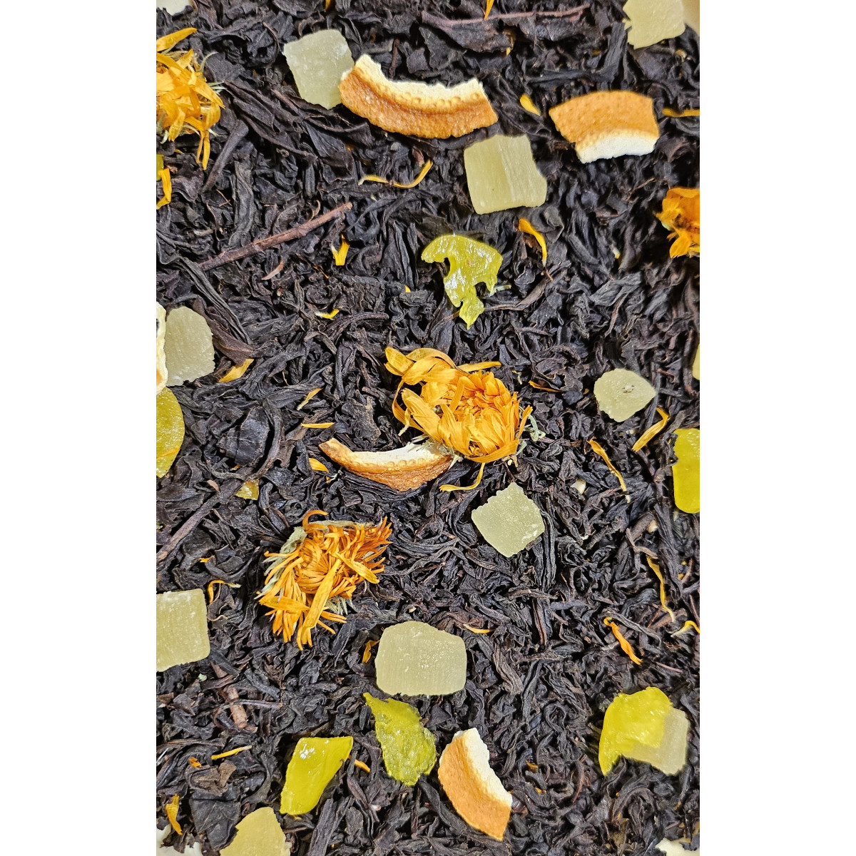 Чай чорний "Будда" - це чорний чорний цейлонський середньолистовий, цедра, шматочки ананаса, шафран, квіти календули, аромат екзотичних фруктів.