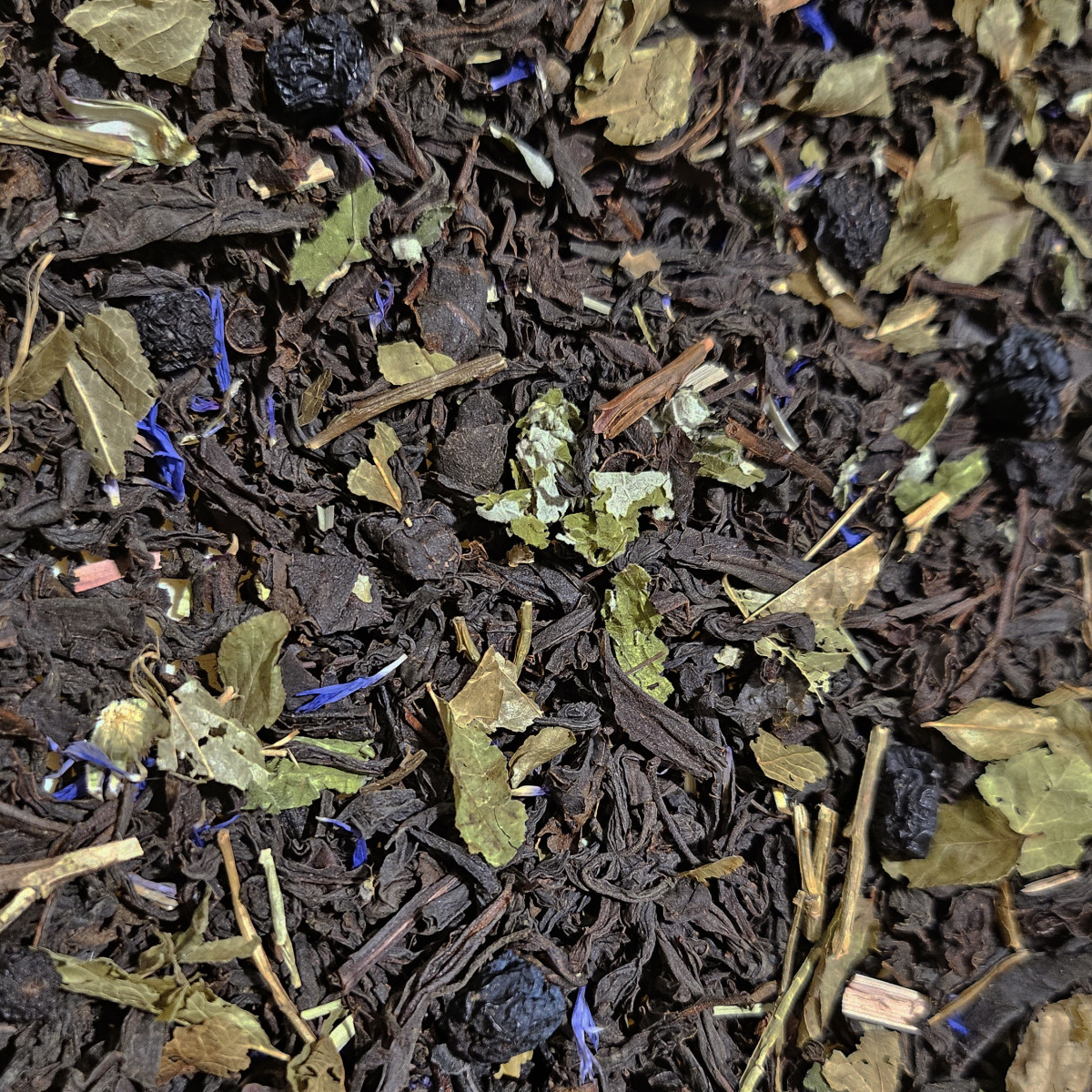 "Чорнична рив'єра" - це чорний цейлонський середньолистовий чай з ягодами і листям чорниці і волошки