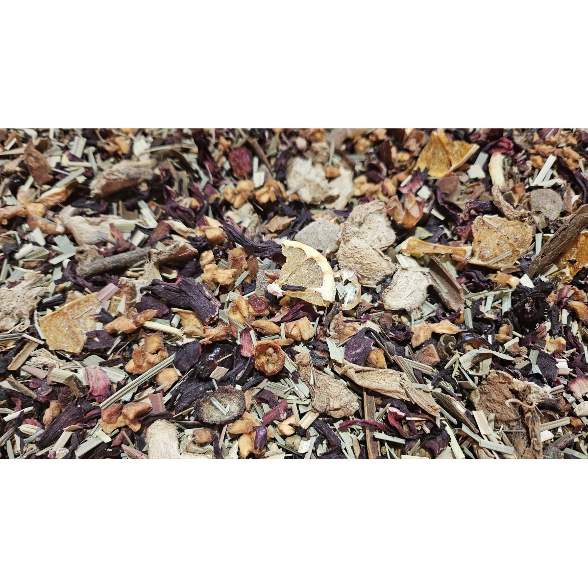 Фруктовий чай "Глінтвейн" - це пряний коктейль з каркаде, імбиру, кардамону, бадьяну, кориці, гвоздики, цитрусової цедри та лемонграсу