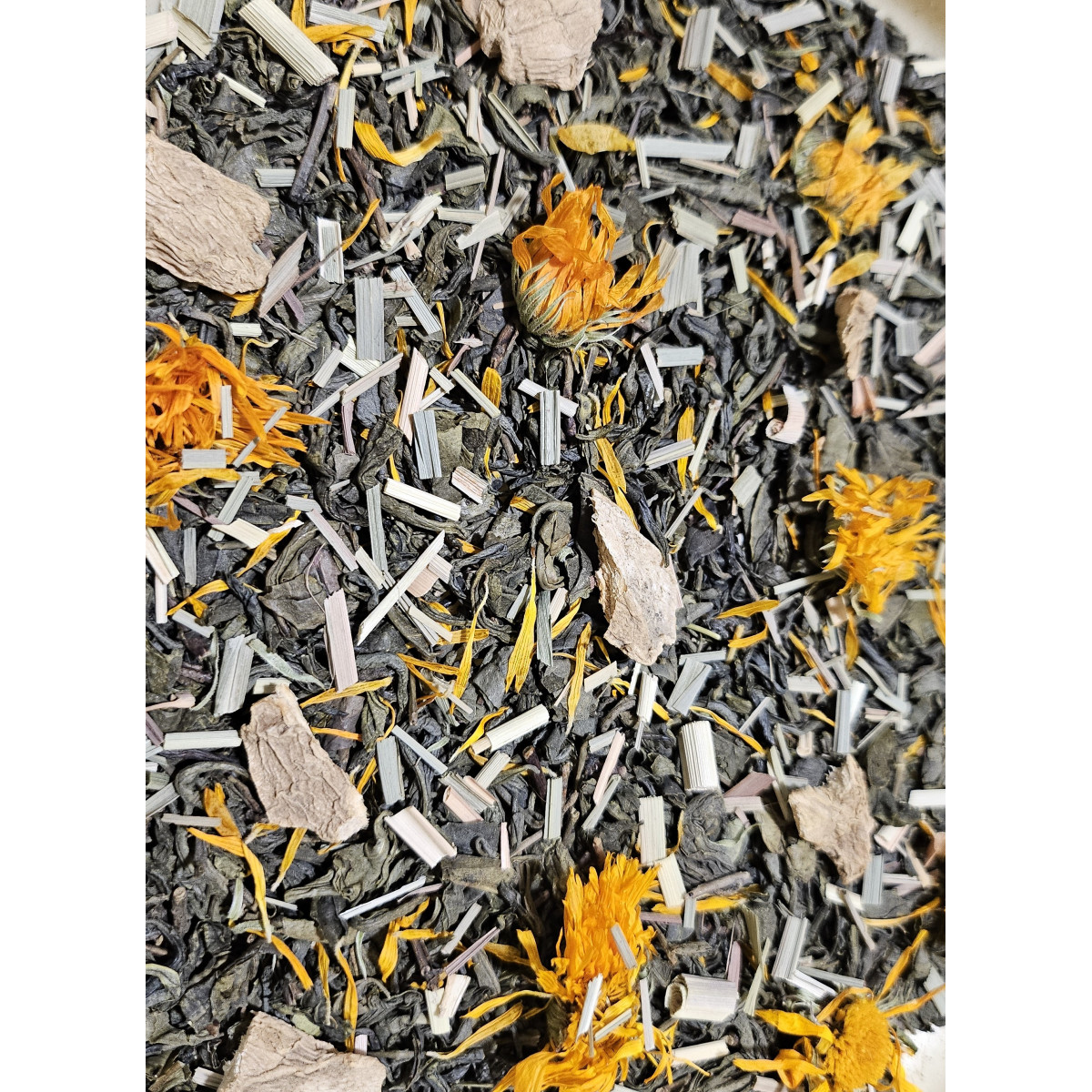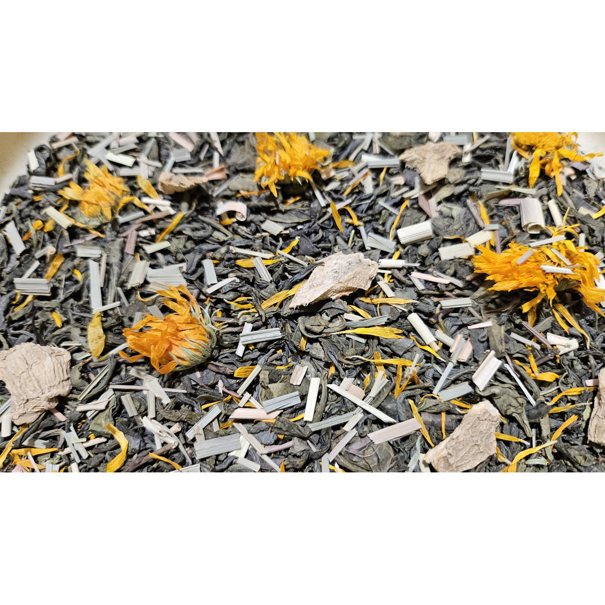 Чай зелений "Імбірний" - це чай китайський зелений, шматочки імбиру та пелюстки календули