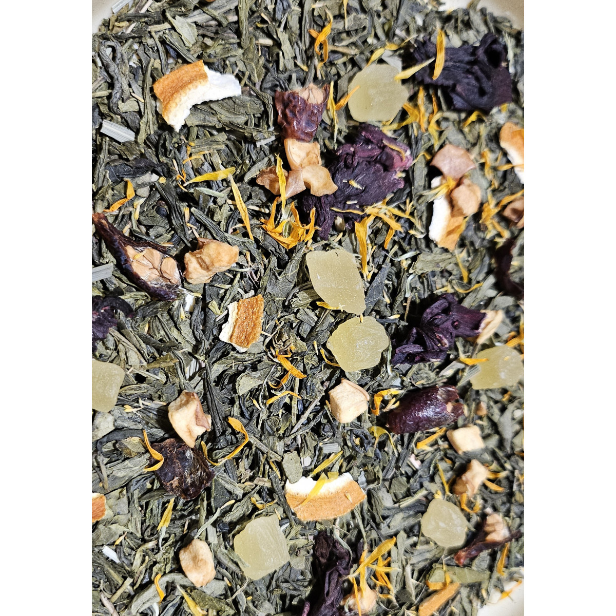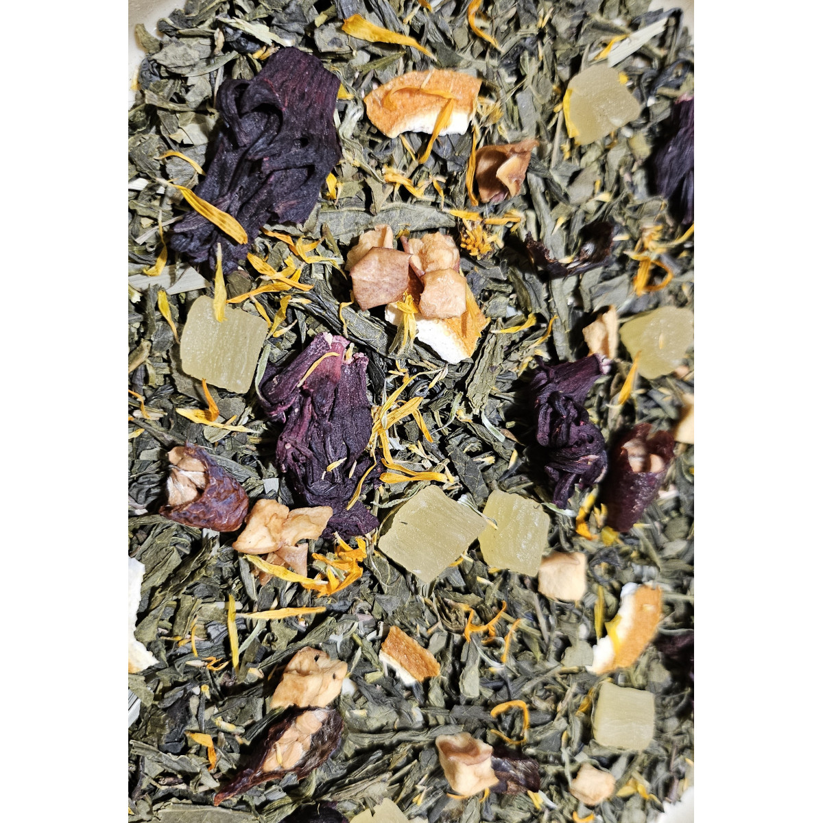 Чай зелений "Імператор" - це японський зелений чай сенча, цитрусова цедра, скориночки шипшини, каркаде, ананасові цукати, шматочки яблука, шафран, аромат екзотичний