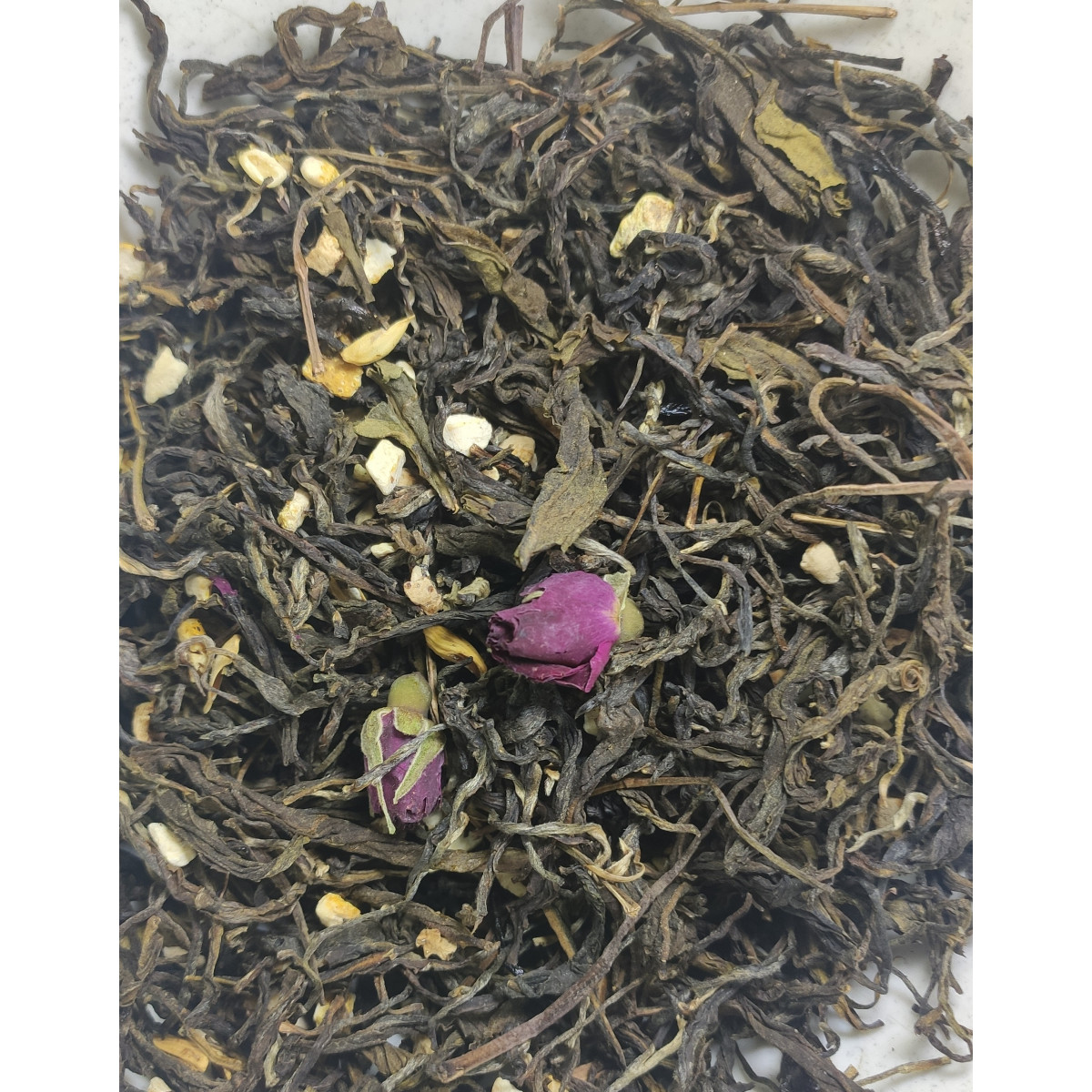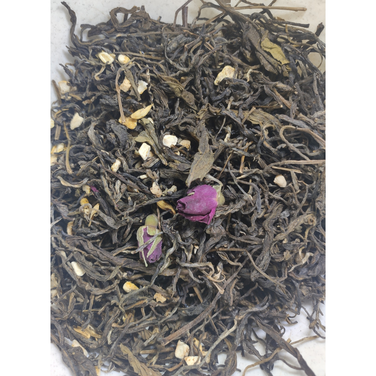 "Пу - ер зелений Калахарі" - це класичний Шен пуер (сирий чай), за смаком та аромау нагадує традиційний зелений чай з легким присмаком класичного пу-ера, з додаванням бутонів троянди та цитрусової цедри.