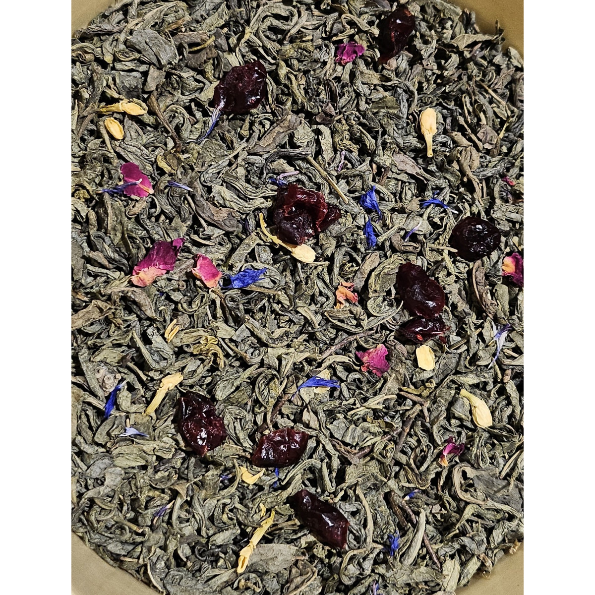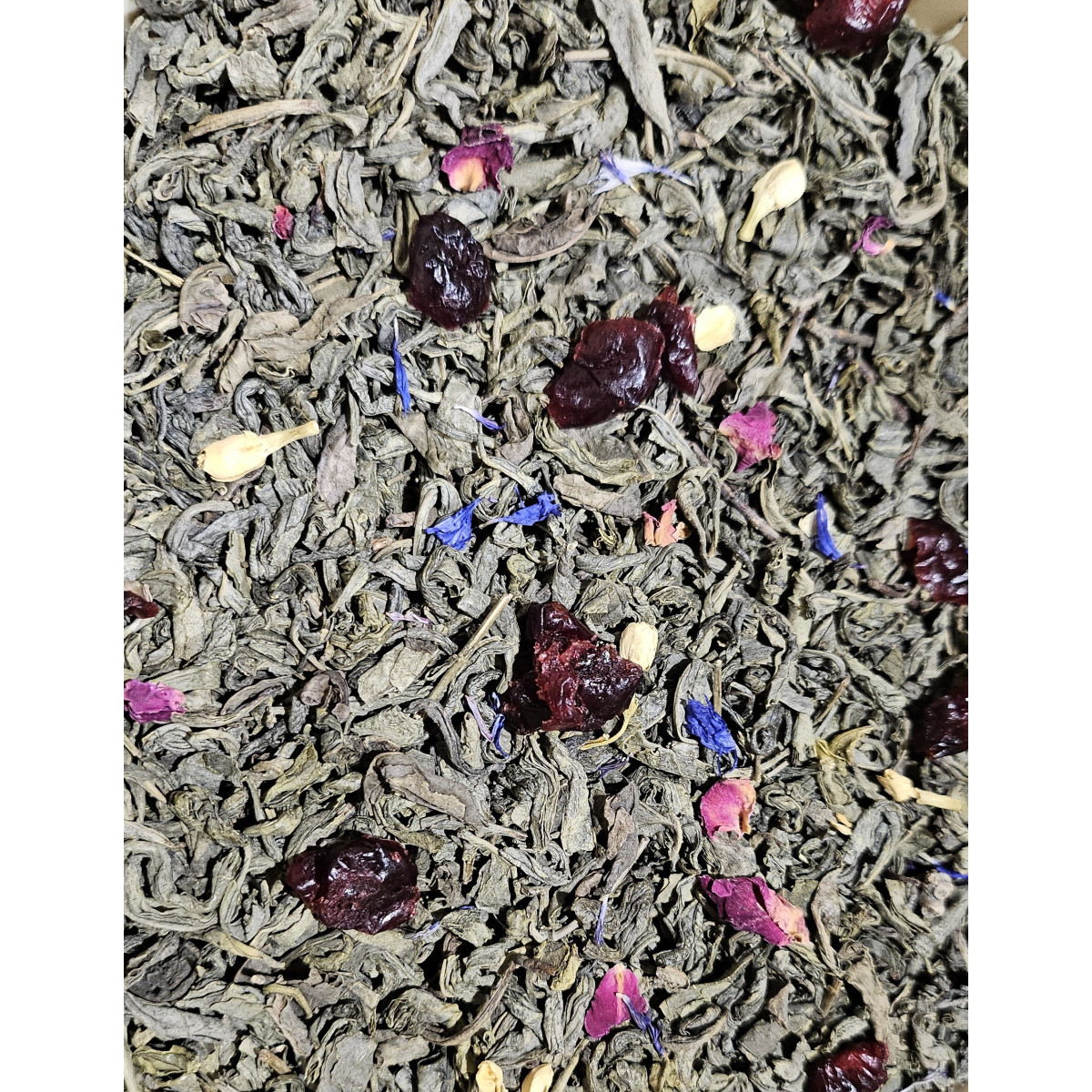 Чай зелений "Казки шахеризади" - це зелений китайський чай ганпаудер, ягоди вишні, пелюстки троянди, волошка, жасмину, аромат вишні в карамелі