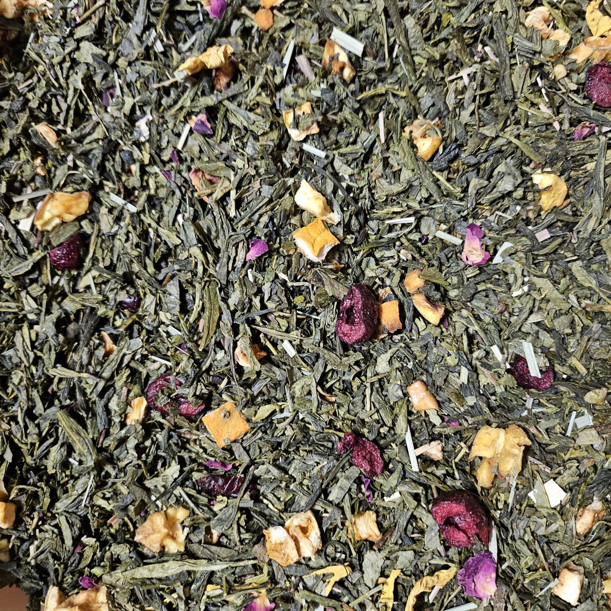 чай зелений "Космополітен" - це чай китайський зелений сенча, шматочки вишні, ананасу та яблука, цедра, пелюстки квітів