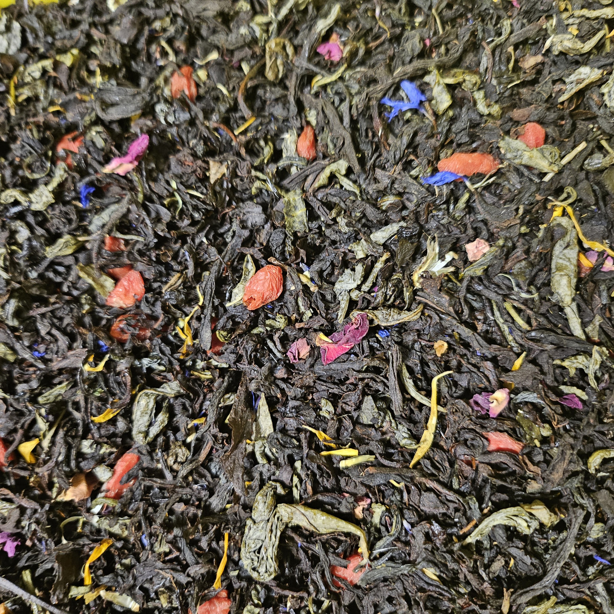 чай "Купаж з ягодами Годжі" - це купаж чорного цейлонського середньолистового та зеленого китайського чаю з ягодами Годжі, пелюстками чайної троянди, волошки, шафрана та мальви