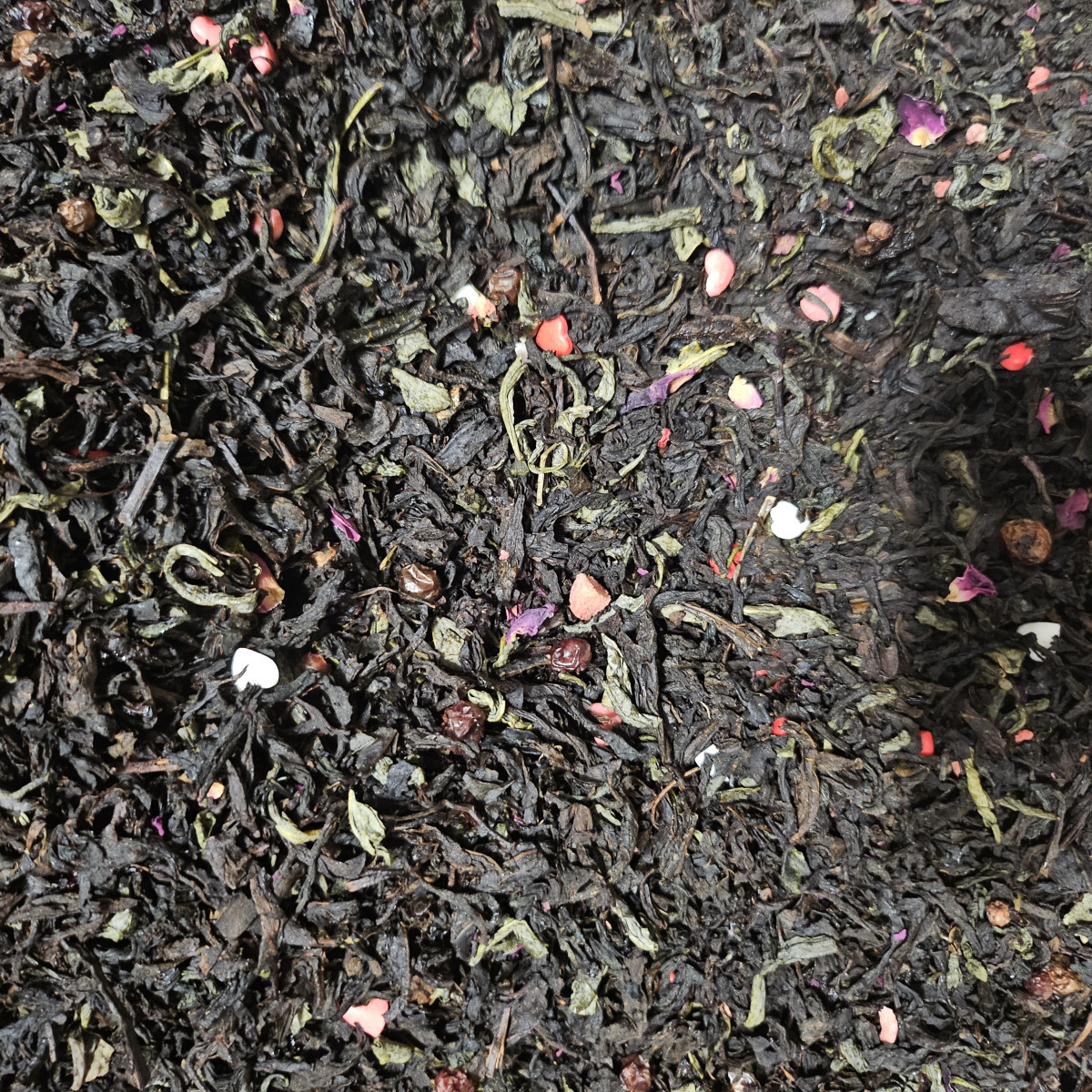 чай "Любовний трикутник" - це купаж чорного цейлонського середньолистового та зеленого китайського чаю з ягодами брусниці, шматочками полуниці, цукровими сердечками та пелюстками чайної троянди