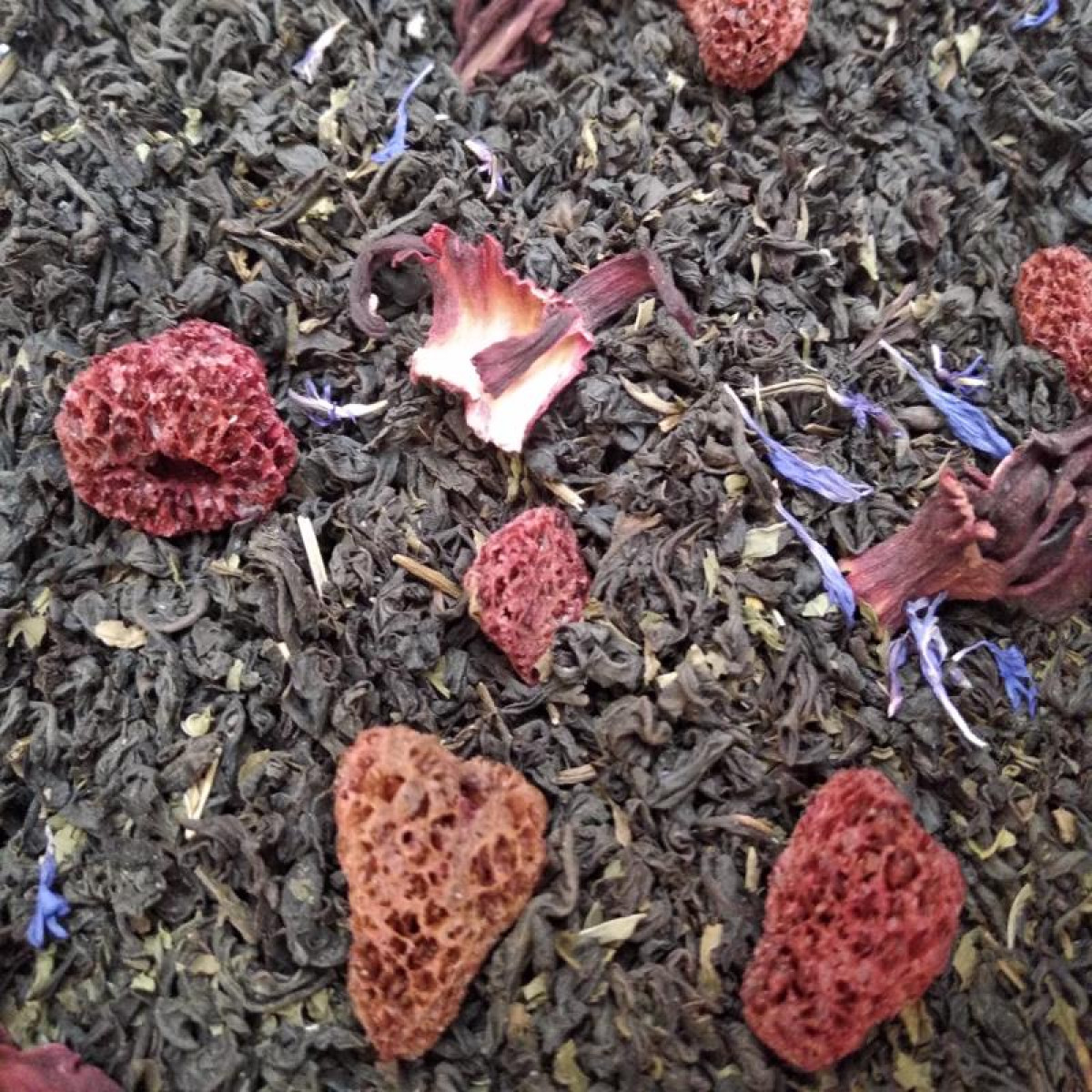 Чай чорний "Малина з вершками" - це чай чорний цейлонський середньолистовий, ягоди малини, лист малини, волошка, каркада.