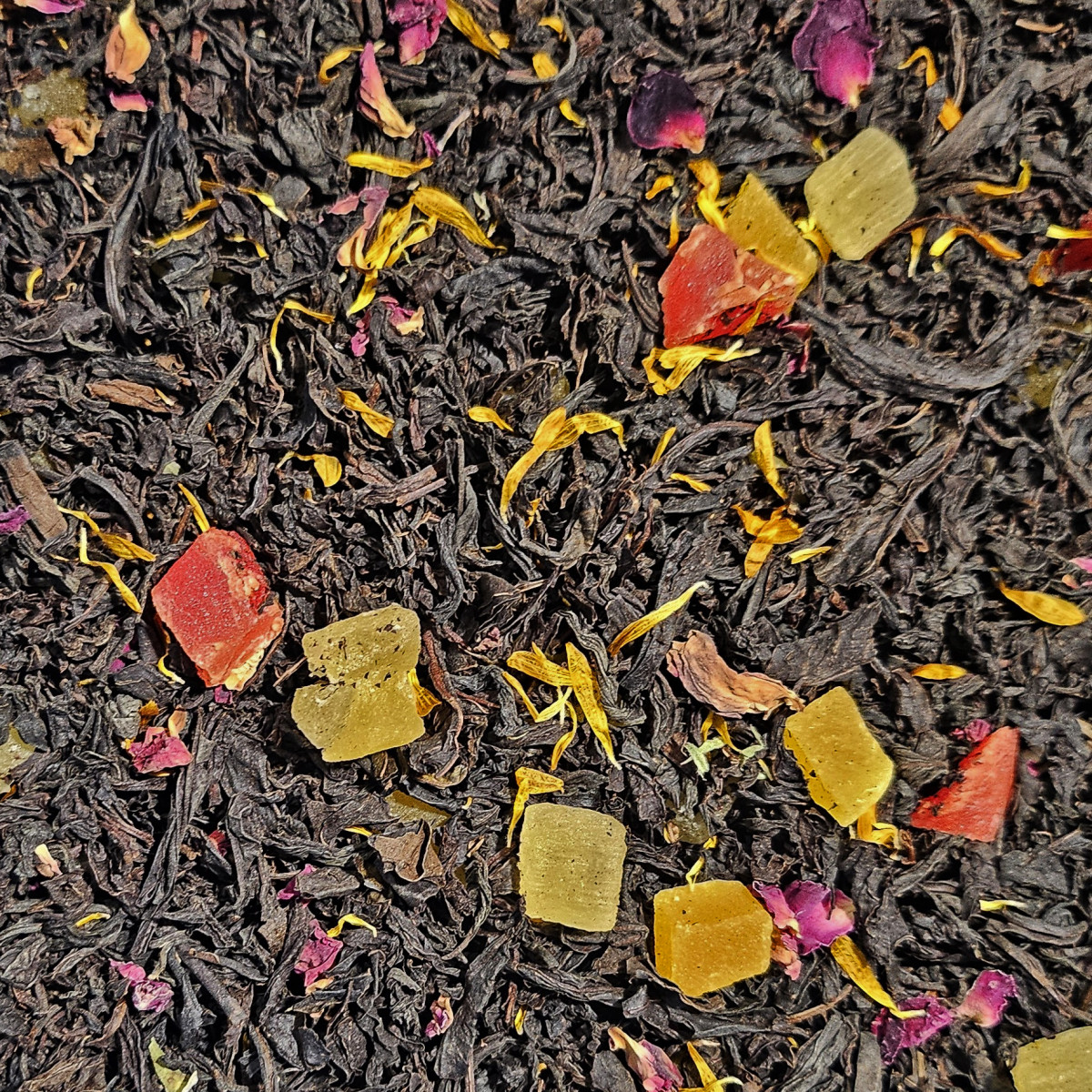 Чай чорний "Манго - маракуйя" - це цейлонський середньолистовий чай з ананасовими цукатами, шматочками манго, папайі, пелюстками чайної троянди і шафрану, з ароматом екзотичних фруктів.