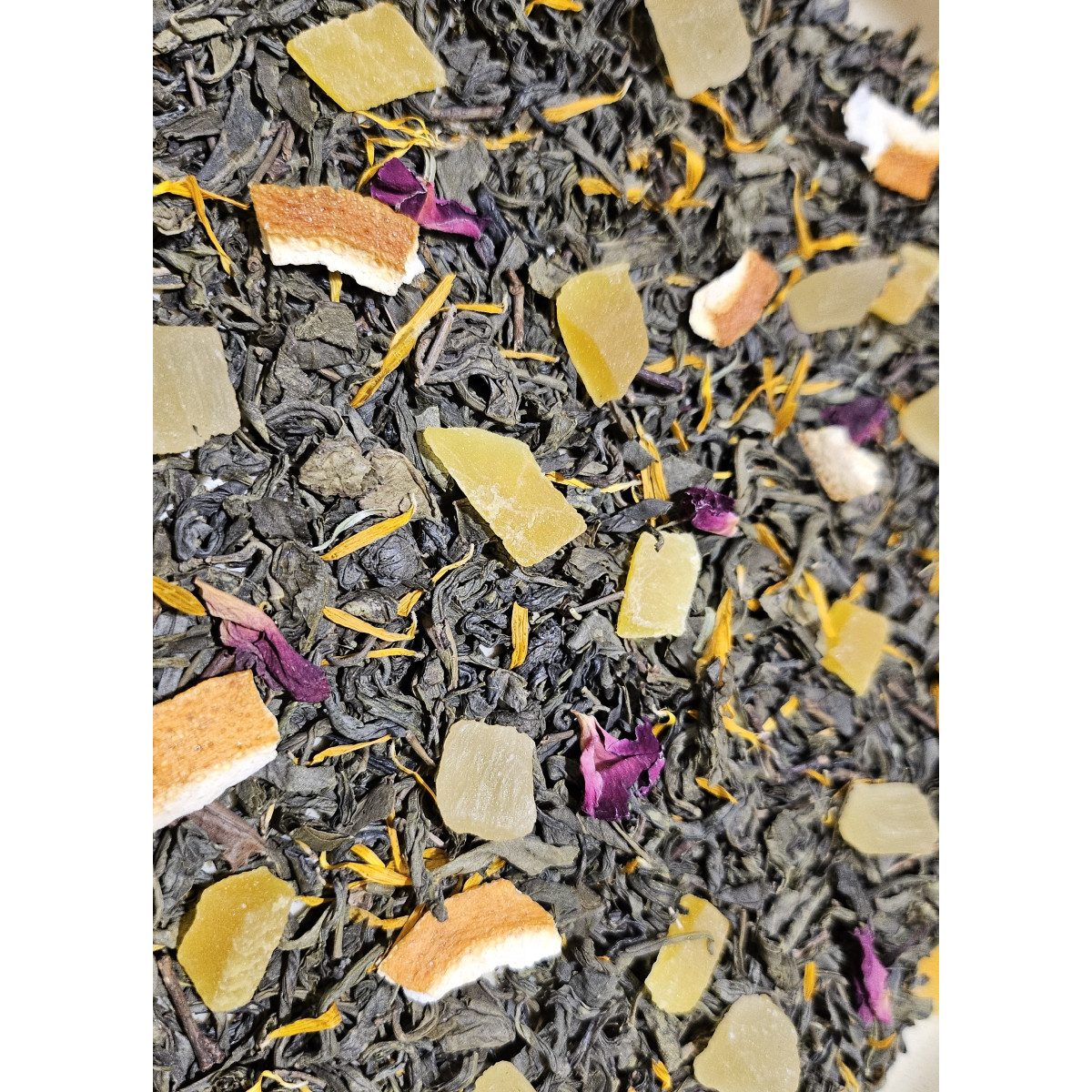 Чай зелений "Манговий" - це зелений китайський чай ганпаудер, цукати манго та ананаса, пелюстки чайної троянди та апельсина, аромат манго та ананаса