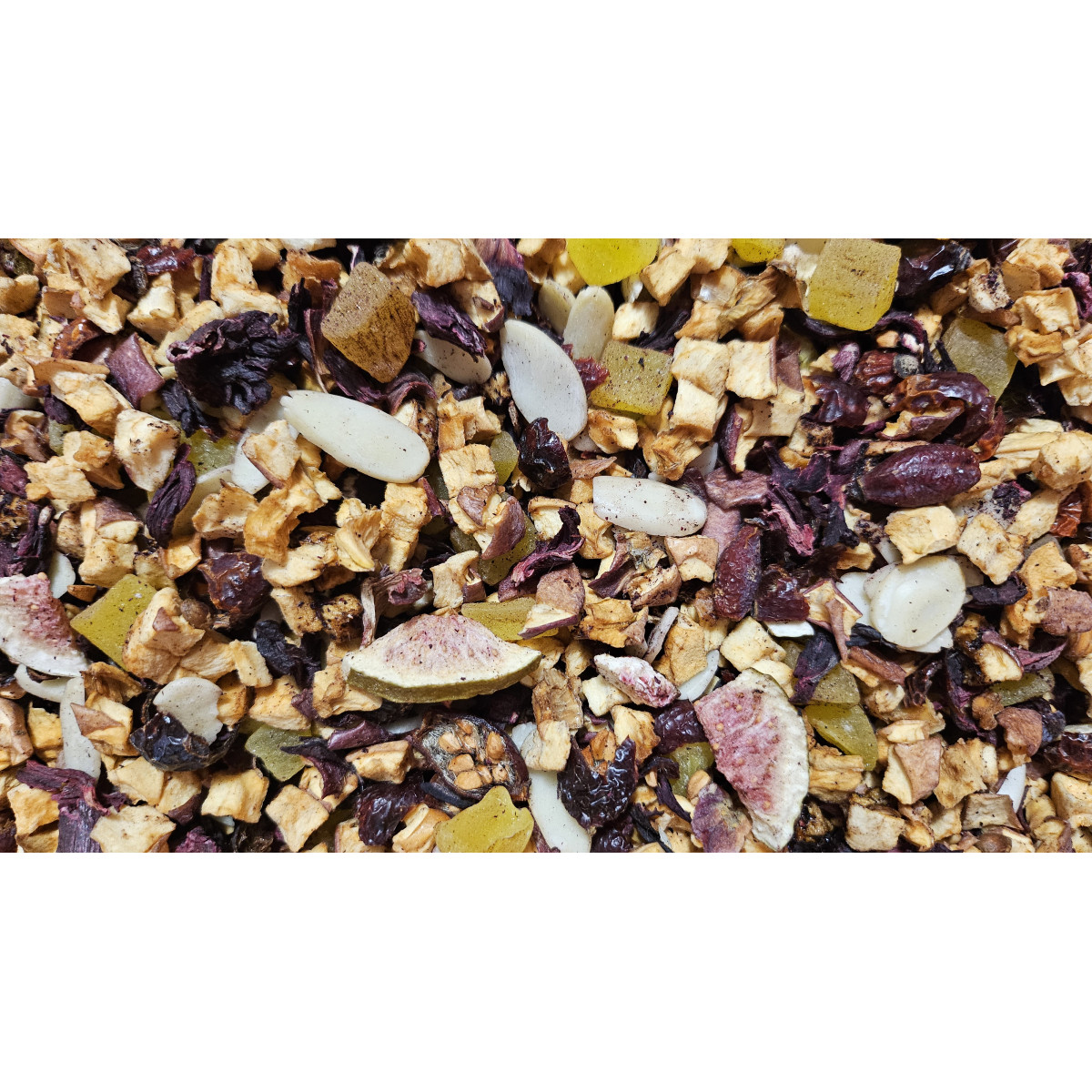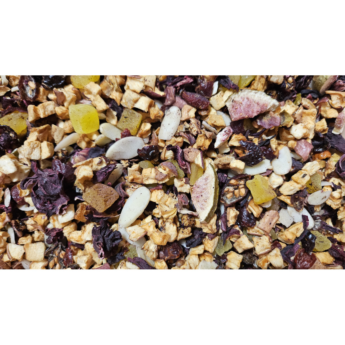 фруктовий чай "Марципан (мигдаль)" - це суміш з яблука, інжиру, ананасу, мигдалю, каркаде, скоринки шипшини