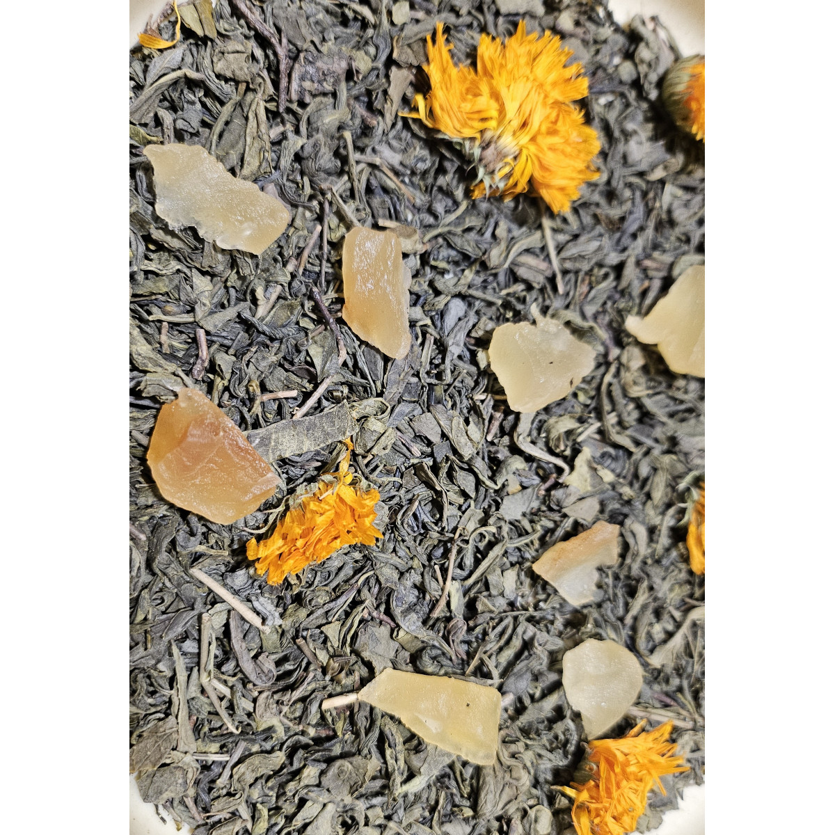 Чай зелений "Персик - абрикос" - це зелений китайський чай ганпаудер, шматочки персика, абрикоса, квіти календули та фруктово-вершковий аромат