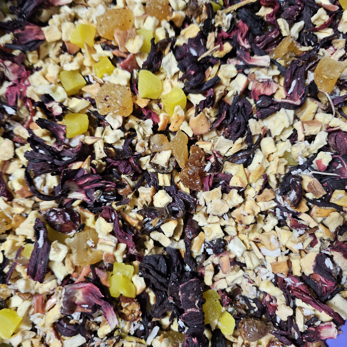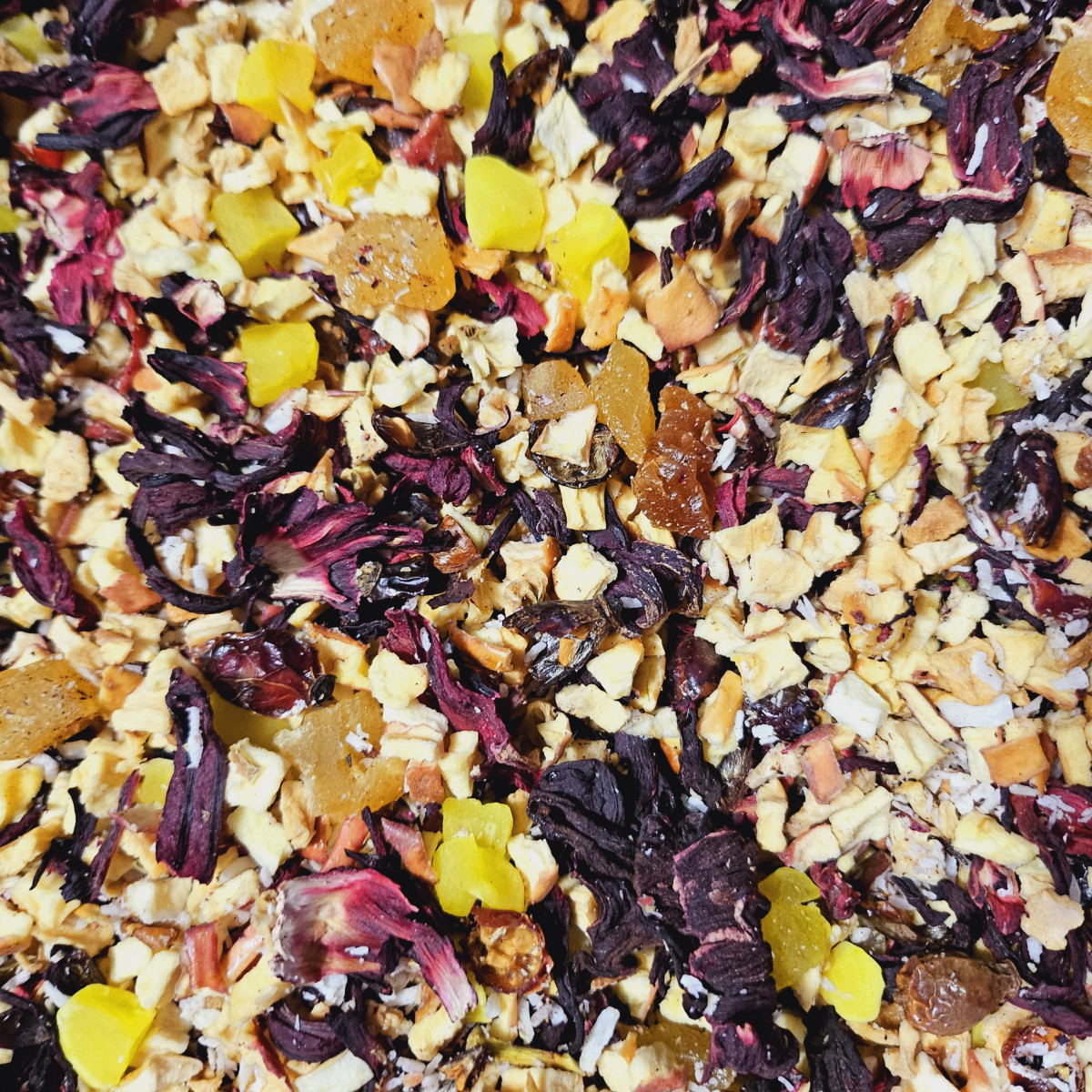 фруктовий чай "Піна Колада" - це суміш з яблука, груші, кокосова стружка, каркаде, ананас, скоринки шипшини