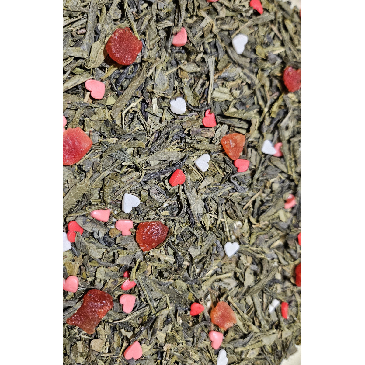 Чай зелений "Полуничний твіст" - це японський зелений чай сенча, шматочки полуниці, червона смородина, цукрові серця, аромат полуниці з вершками.