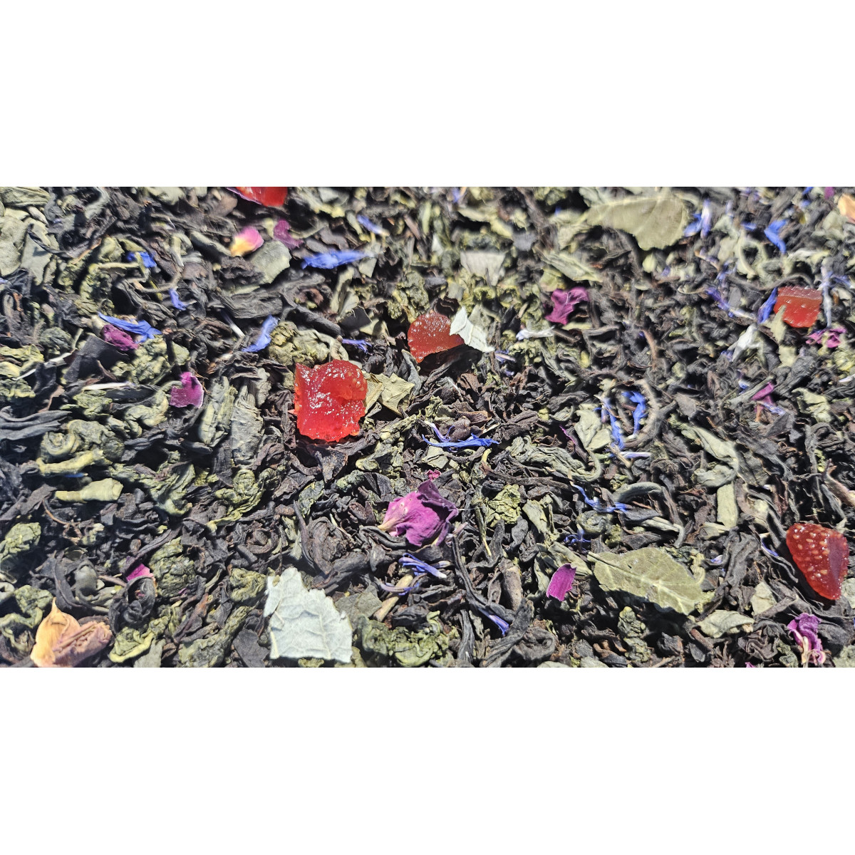 Чай "Полуничний з ванільним ароматом" - це купаж чаїв чорного цейлонського середньолистового та зеленого китайського Високогірного з пелюстки чайної троянди, шматочками полуниці, ароматом полуниці та вершків.