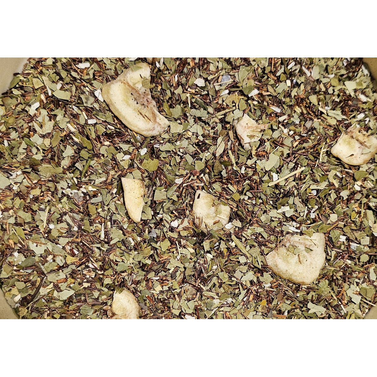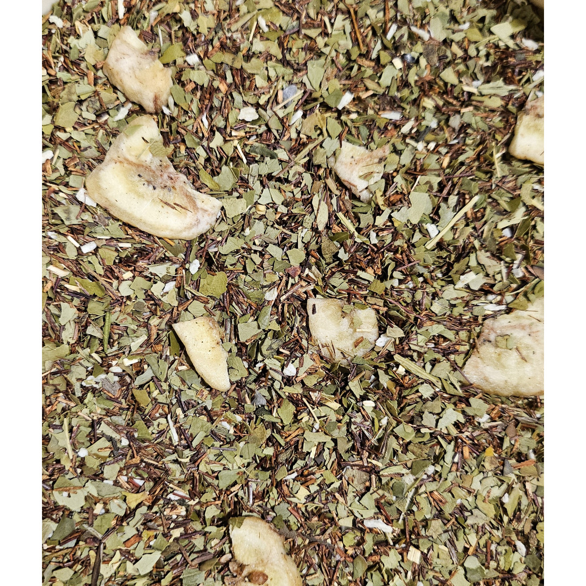 трав'яний чай "Каліпсо" - це суміш Південноафрицького червоного ройбушу та парагвайського мате з додаванням бананових та кокосових чіпсів.