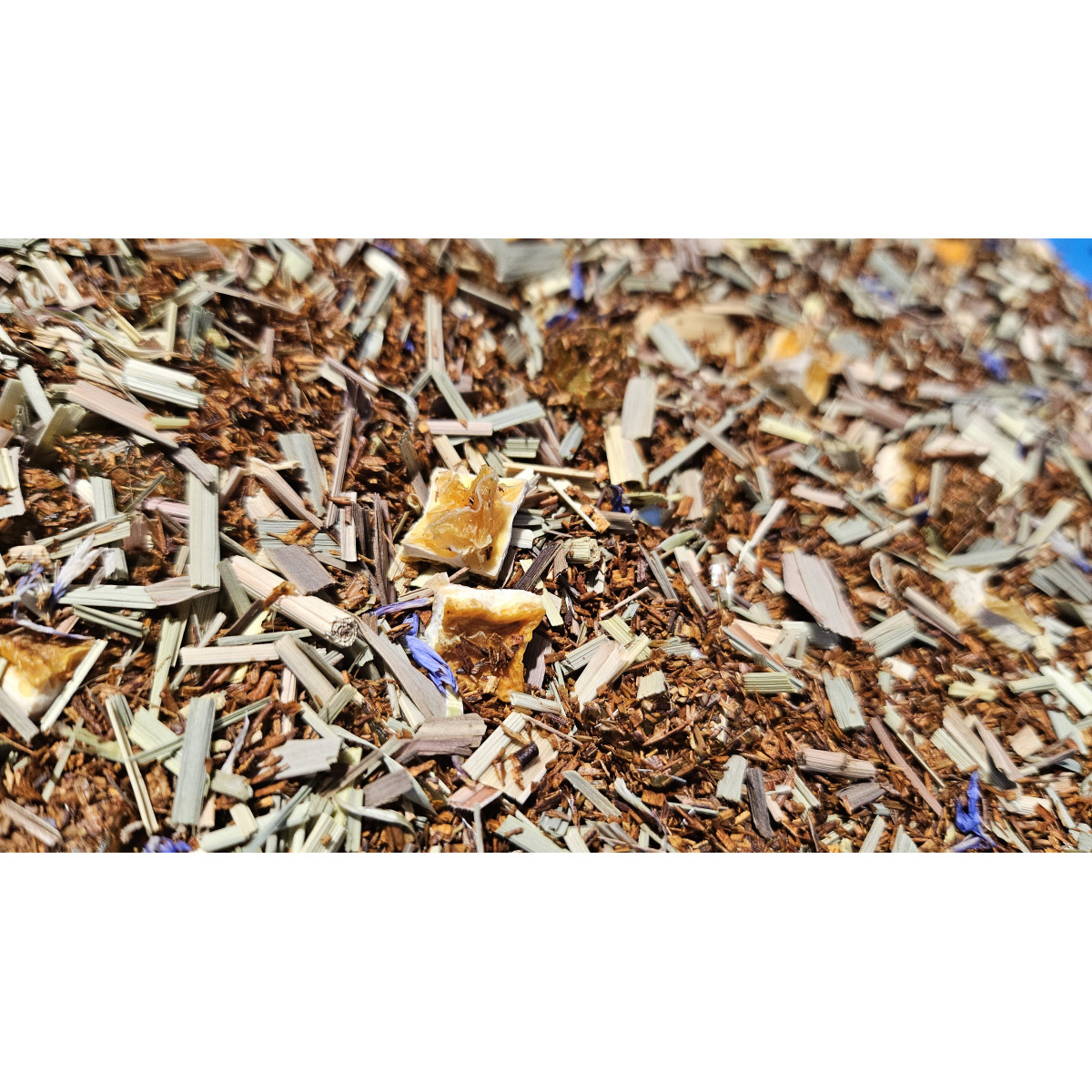 Трав'яний чай "Ройбуш оранж" (Ройбос) - це подрібнений червоний південно-африканський кусратник ройбуш (ройбос) з додаванням сушеного апельсина та шматочків кумквату, лимонної трави та волошки.