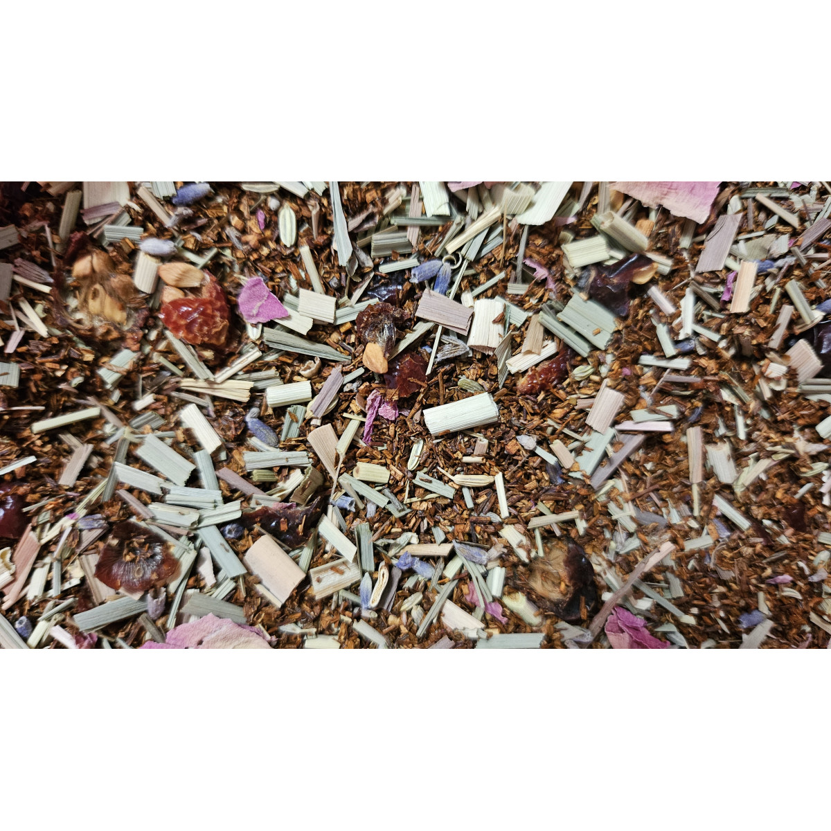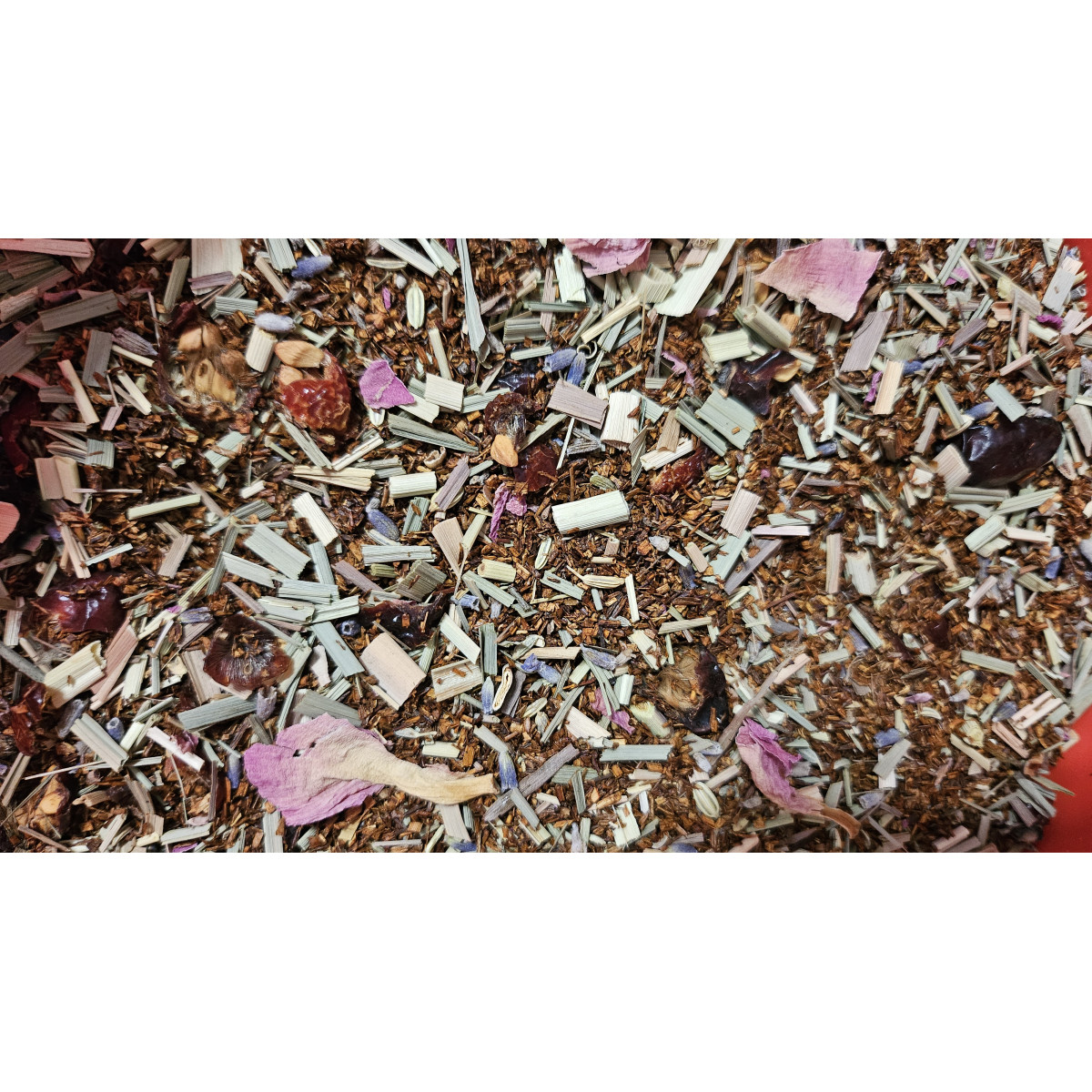 трав'яний чай "Ройбуш Рецепт молодості" - це подрібнений червоний південно-африканський кущ ройбуш (ройбос) з додаванням лаванди, шипшини, фенлехя, пелюсток півонії та лемонграсом.