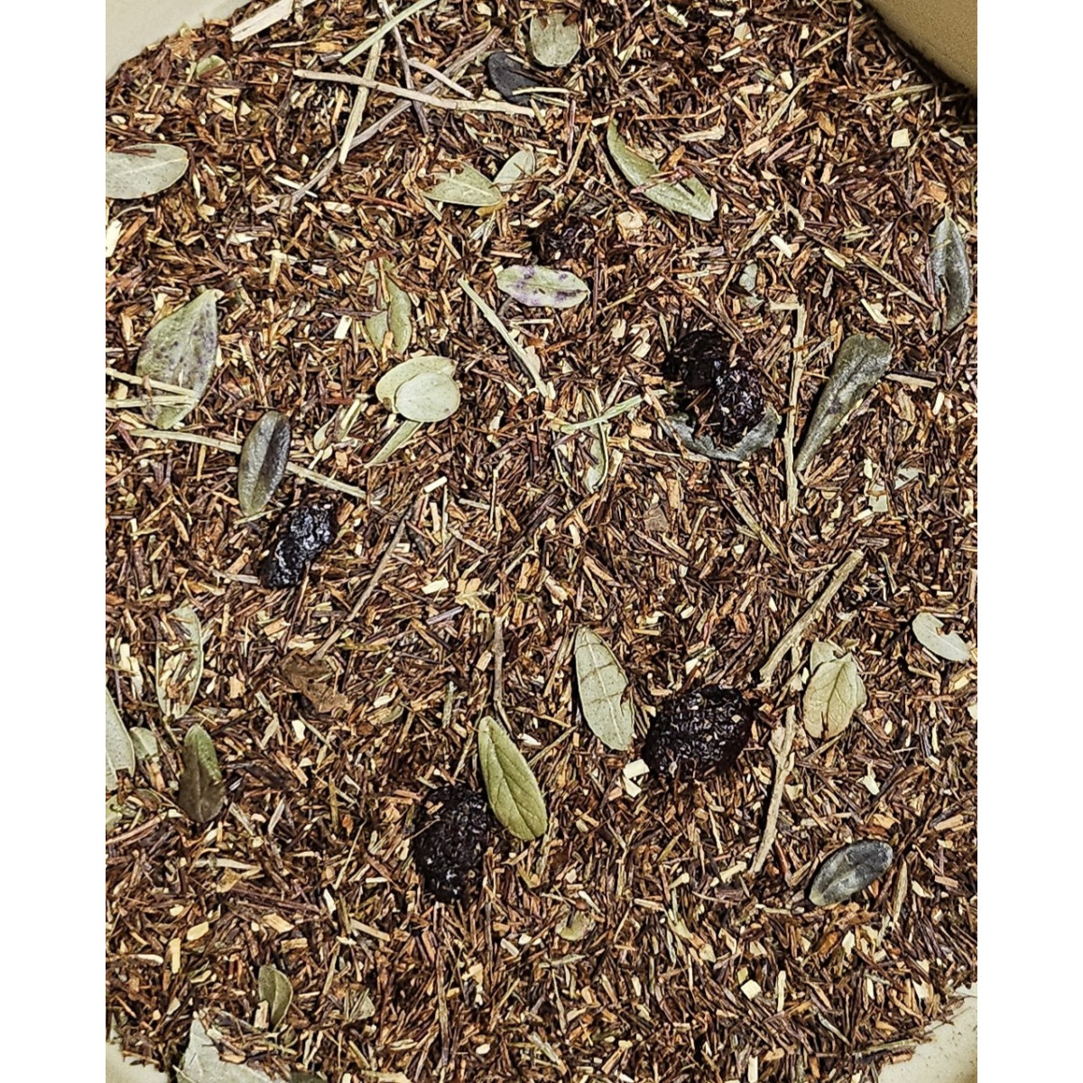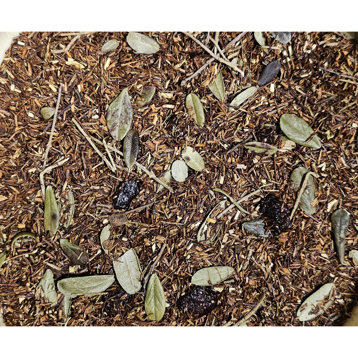 трав'яний чай "Ройбуш з вишнею" - це подрібнений червоний південно-африканський кущ ройбуш (ройбос) з додаванням червоних ягід вишні та листям брусниці