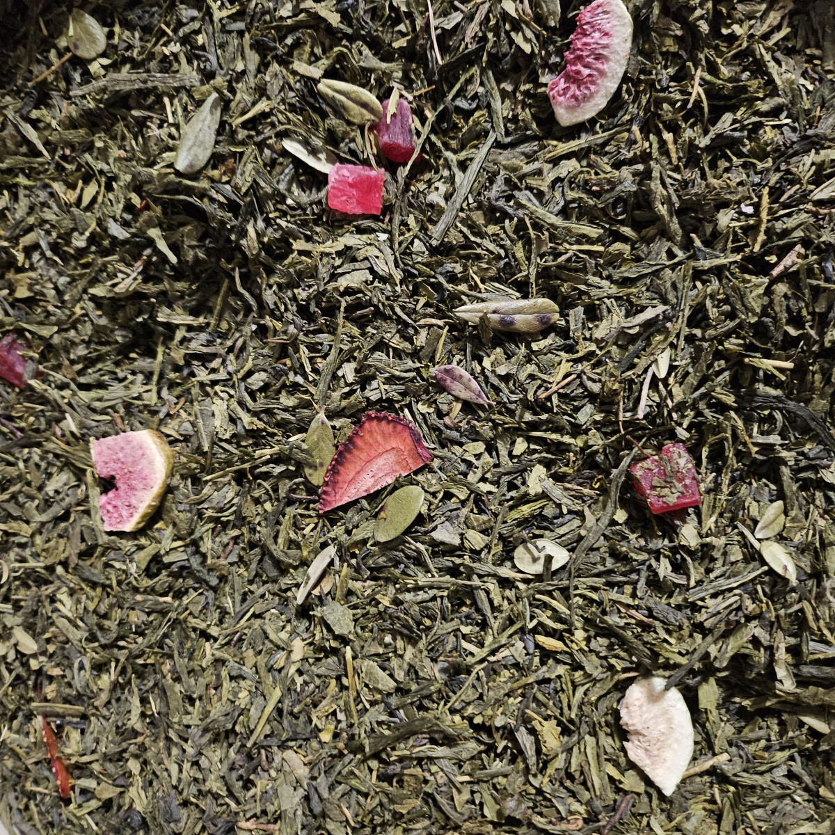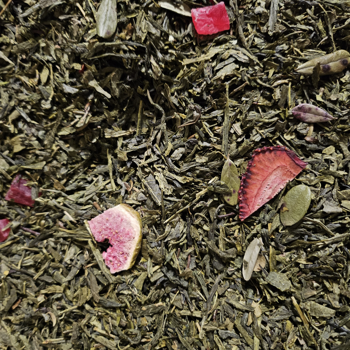 чай зелений "Соковитий інжир" - це чай китайський зелений сенча, шматочки інжиру, папайї, полуниці, лист брусниці
