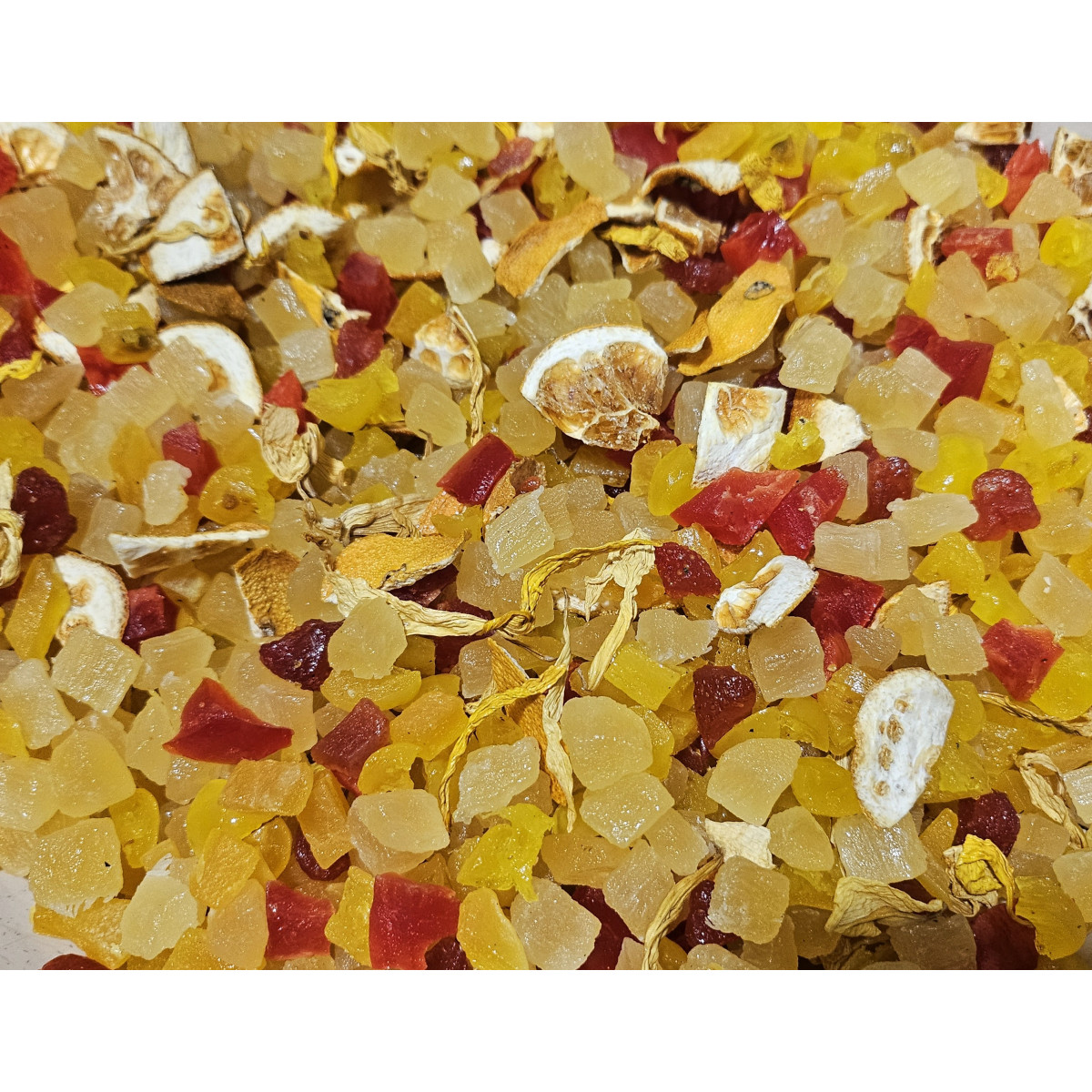 Фруктовий чай "Солодкий поцілунок" - це вітамінний коктейль зі шматочків ананаса, лимона, полуниці, папайї, манго, пелюсток соняшника та шафрану.