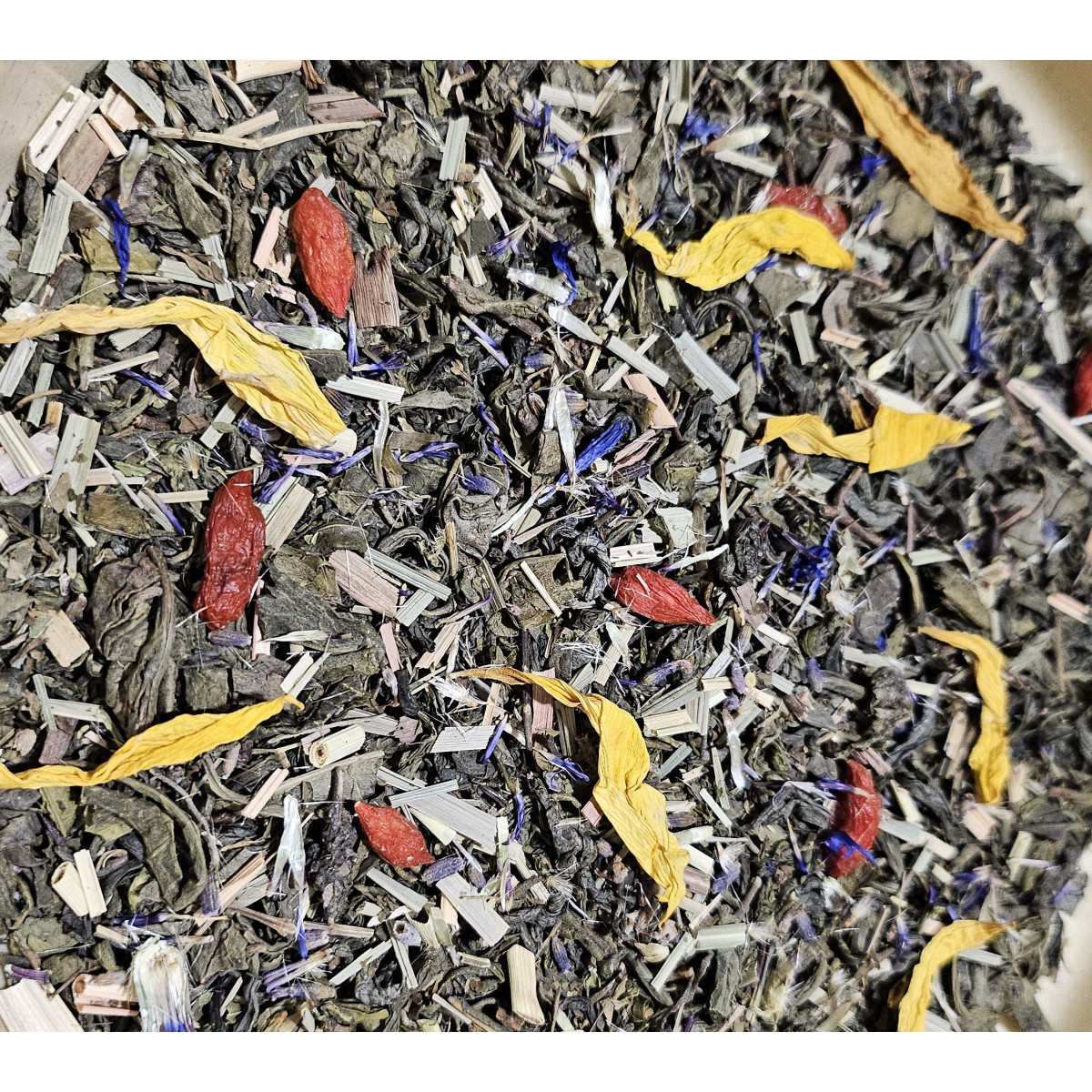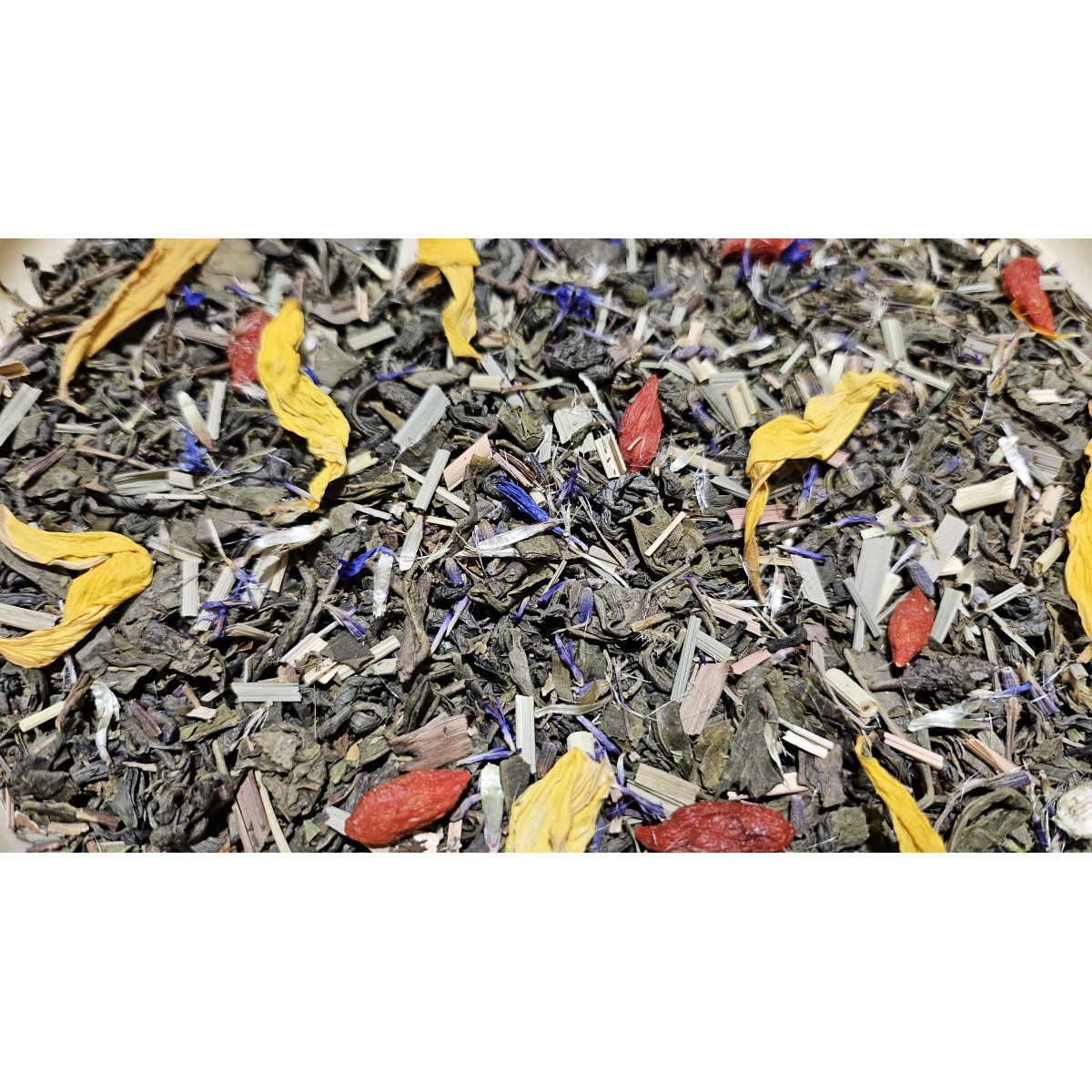 Чай зелений "Давній Китай" - це зелений китайський чай ганпаудер, пелюстки соняшника та волошка, лаванда, ягоди годжі, лимонна трава, аромат апельсину.