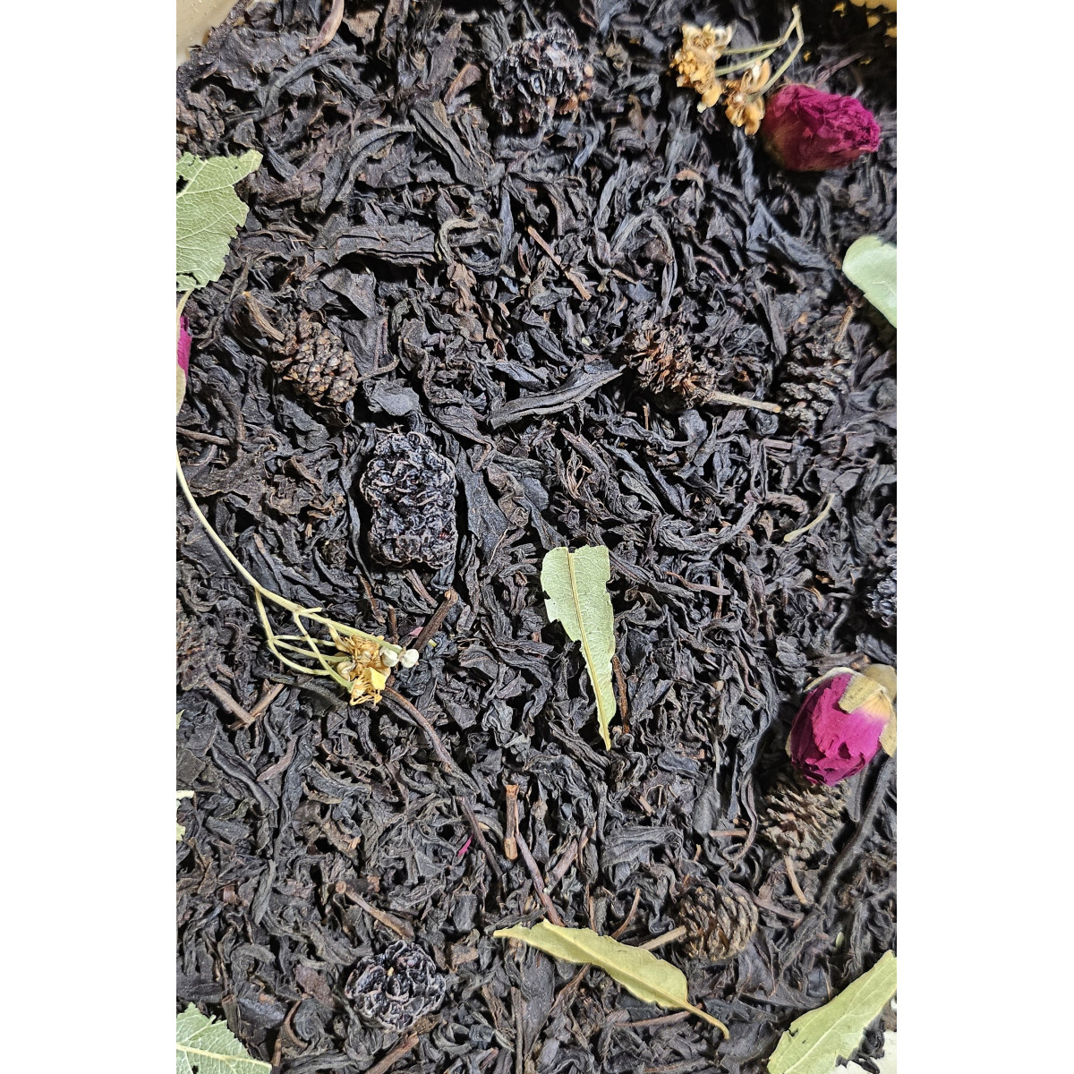 Чай чорний "Тріумф" - це чай чорний цейлонський середньолистовий з бутонами троянди, шишками вільхи, ягодами шовковиці, квітами липи та карамельно-цитрусовим ароматом.