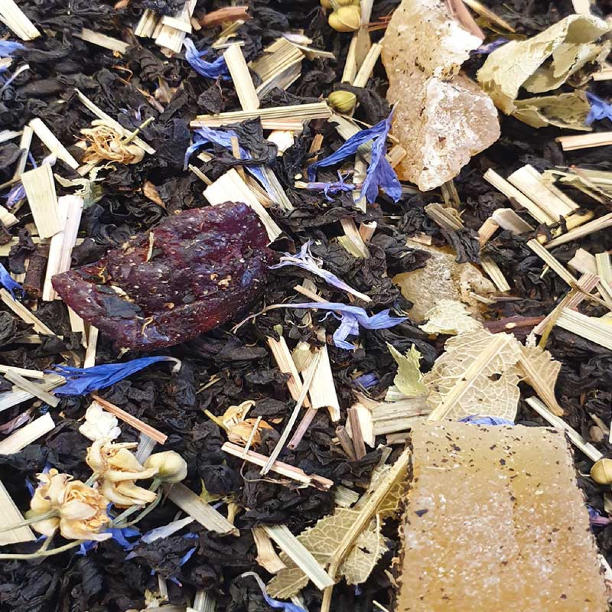 Чай чорний "З динею" - це чай чорний цейлонський середньолистовий, шматочки дині, лимонна трава, в'ялена вишня, липа, каркаде, шафран, аромат дині та ананаса.