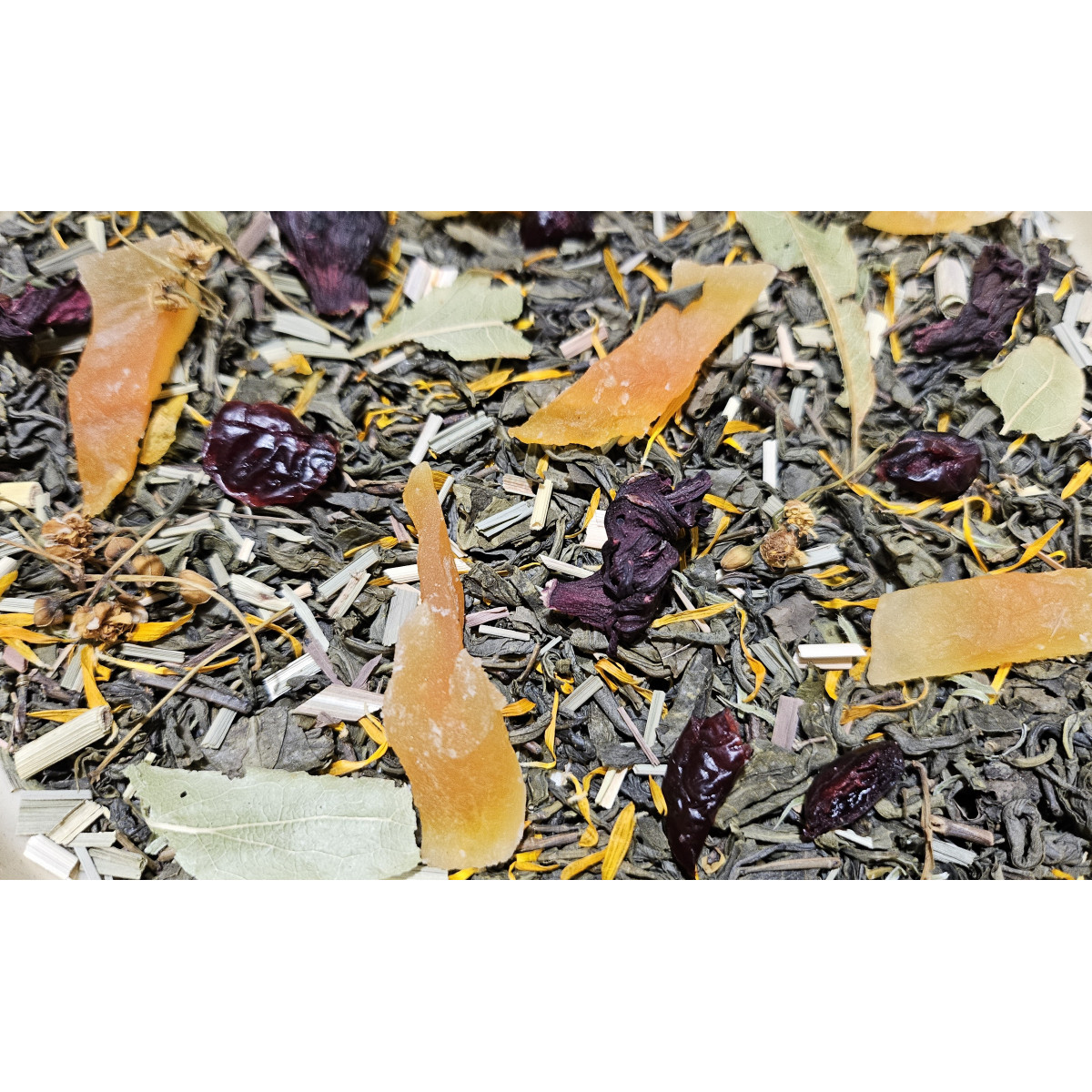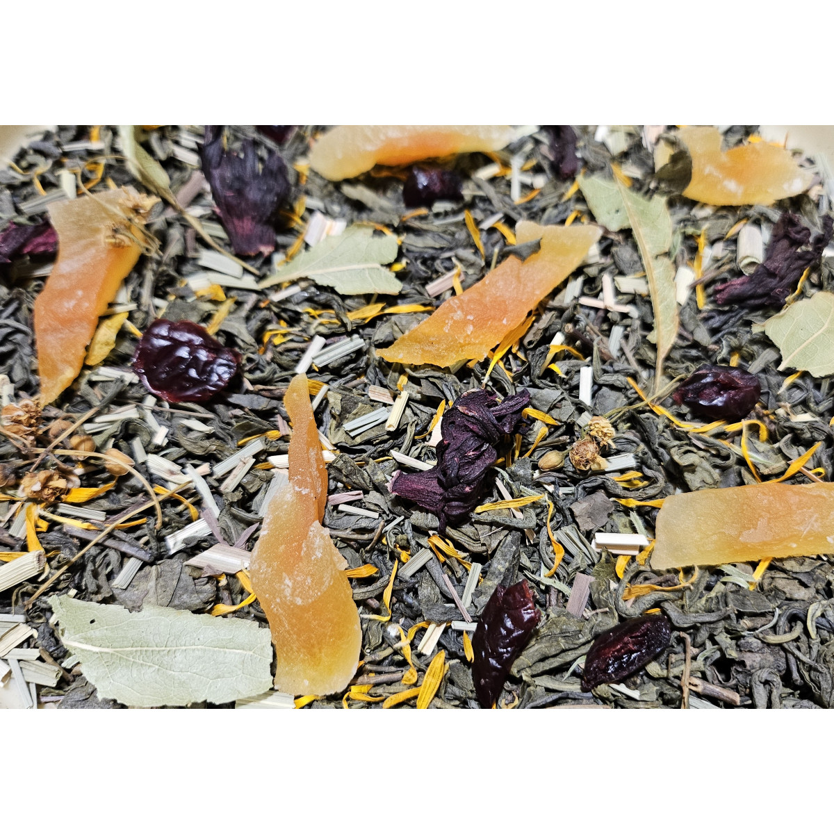 Чай зелений "З Динею" - це зелений китайський чай ганпаудер, шматочки дині, лимонна трава, в'ялена вишня, липа, каркаде, шафран, аромат дині та ананасу
