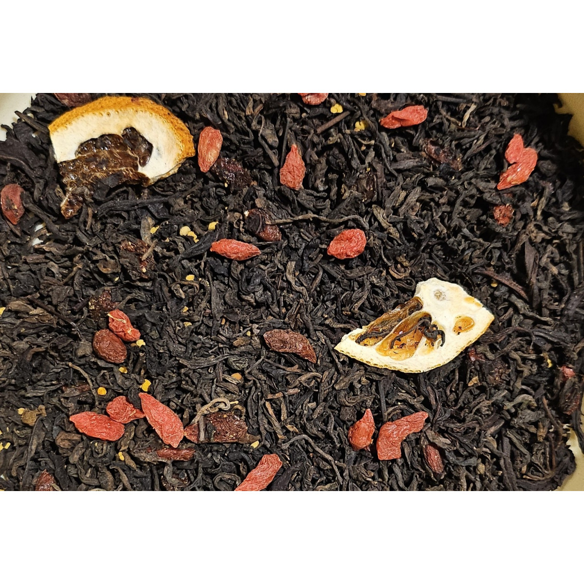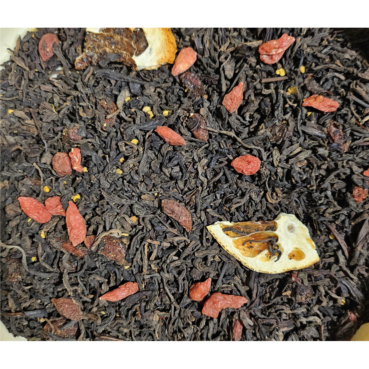 "Пу - ер з Годжі" - це класичний Шу пуер (постферментований) чай з натуральним земляним присмаком та ароматом, а також усіма властивостями натурального земляного чаю з додаванням ягід Годжі, медових гранул, апельсинових чіпсів