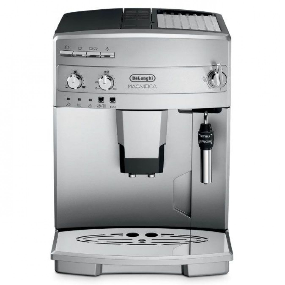 Гарний пластиковий корпус, зручні кнопки, що знаходяться у верхній частині блоку – переваги MAGNIFICA S ESAM 03.120.S – Під кнопками включення, вибору однієї або двох чашок, подачі пари розробниками розміщені регулятори води у чашці та кількості кавового порошку в порції. Ви можете вибрати всі ці параметри самі, на ваш смак. Електронний контроль температури, програмування жорсткості води та багато інших характеристик цієї машини дозволяють приготувати найсмачніший напій.